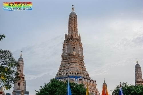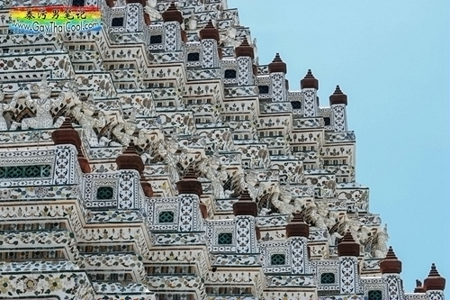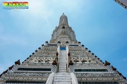 黎明寺的主塔是一座约86米高的大乘舍利式佛塔(也有说主塔高79米),这座佛塔也是泰国境内最高的佛塔,所以也有泰国埃菲尔铁塔的美称。 主塔中供奉着佛祖舍利和拉玛二世的骨灰。除了外国人到此参观以外,也有很多泰国人到这里拜拜。 塔尖处还有一顶金冠,是由拉玛三世下令安放的。 这座主塔象征着佛国中的须弥山,在主塔周围的四个方位,各有一座陪塔,代表佛国中的四大部洲。每座陪塔的顶端都供奉着骑白马的风神。 主塔位于黎明寺的正中心,四周各有一条陡峭的阶梯,可以上到主塔的二层,从这里可以俯瞰湄南河和对岸的大皇宫(现在暂时关闭,不能登上去)。 主塔每一层的入口都有两座中式武将门神石像。这些石像造型各异,有武将门神,也有文官和动物等造型。 由于19世纪中国的商船到泰国,大部分商船内都会载一些雕刻精美的压舱石,以防止翻船。所以这个时期的寺庙受到中国文化的影响,会有很多中式的雕像。 主塔的底座和塔身层数很多,从底座到塔顶的墙面绘有各种图画和花纹。 墙面整体镶嵌了各种彩色陶瓷片,形成图案和花纹,陶片的颜色和造型各异。总体瓷片数量非常巨大,总共约有百万件之多。 塔的每一层作为支撑的神像也都不一样。第二层由夜叉恶灵守卫神像支撑。第三层由哈鲁曼神像的柱子支撑。第四层是一些神灵的神像支撑。 主塔最顶部,每一面都有壁龛,供奉着骑着三头白象的天神之王因陀罗的雕塑。 塔群的西北方位,还有一座大雄宝殿,大殿外有两座6米高的守门夜叉,也是很多人来拍照打卡的地方。