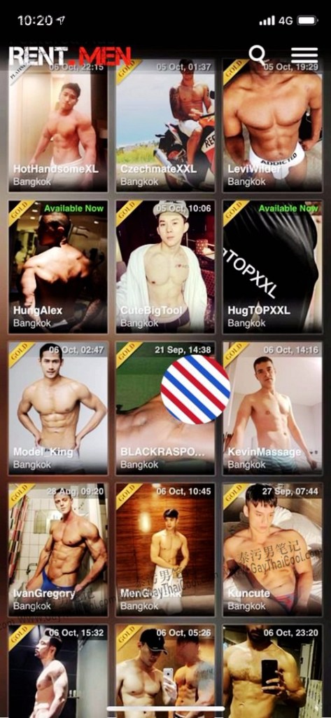 Rent.Men及这些平台在中国区域是严格禁止的,但在泰国却变成极其活跃的交流平台。来自各个国家不同肤色的仔仔都在网站上开立账户提供陪游及男伴服务。平台还提供了身份和照片认证服务。规模不亚于同志圈的Blued、Jackd等大型交友APP。