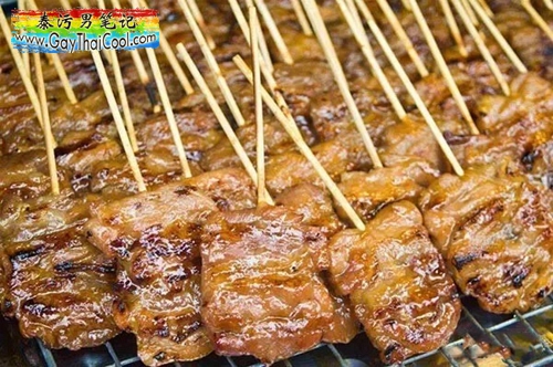 烤肉串搭配糯米饭是泰国夜市街头常见的小吃之一,夜市许多泰国学生钟爱的早餐食品,独特的泰式配方腌制的猪肉串,来一袋热气腾腾的糯米饭,一口一串吃起来才爽!