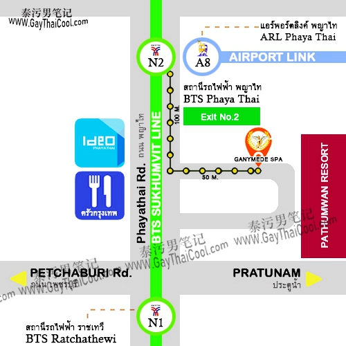 从BTS Praya Thai站下来,走200米就可以到Ganymede Spa。如果开车,可以直接将车停在Ganymede边上的Resort,付点停车费就好了。