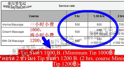 至于小费部分,一小时(最低)小费1000泰铢,两小时(最低)小费1200泰铢;
