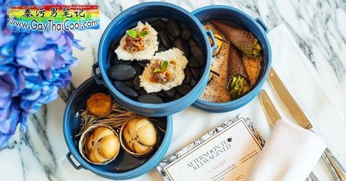 共计五个Course的下午茶按续呈现,顺序跟主题都有讲究,造型更是骚到爆表。首先上席的是西式点心(Canapés),装在泰国传统三层饭盒里送来。共计五种点心甜咸均有,大小基本都是一两口的水平,足够精致有趣。