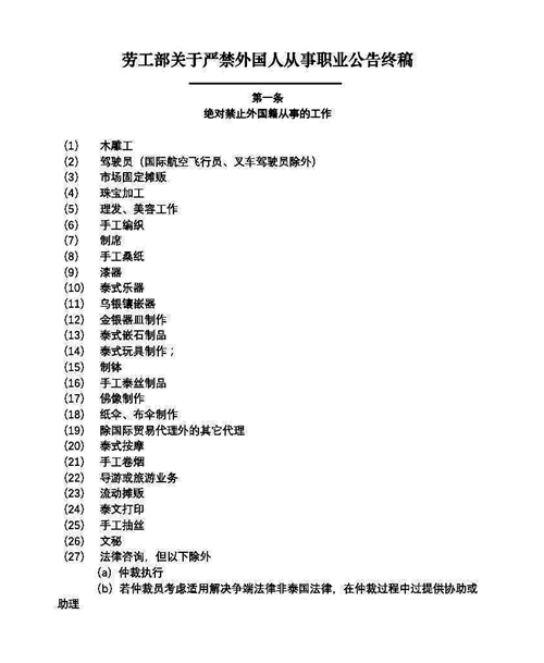(1)木雕工; (2)驾驶员(国际航空飞行员、叉车驾驶员除外); (3)市场固定摊贩; (4)珠宝加工; (5)理发、美容工作; (6)手工编织; (7)制席; (8)手工桑纸; (9)漆器; (10)泰式乐器; (11)乌银镶嵌器; (12)金银器皿制作; (13)泰式嵌石制品; (14)泰式玩具制作; (15)制钵; (16)手工泰丝制品; (17)佛像制品; (18)纸伞、布伞制作; (19)除国际贸易代理以外的其他代理; (20)泰式按摩; (21)手工卷烟; (22)导游或旅游业务; (23)流动摊贩; (24)泰文打印; (25)手工抽丝; (26)文秘; (27)法律咨询,但以下除外: (a)仲裁执行; (b)若仲裁员考虑适用解决争端的法律非泰国法律,在仲裁过程中提供协助的助理;