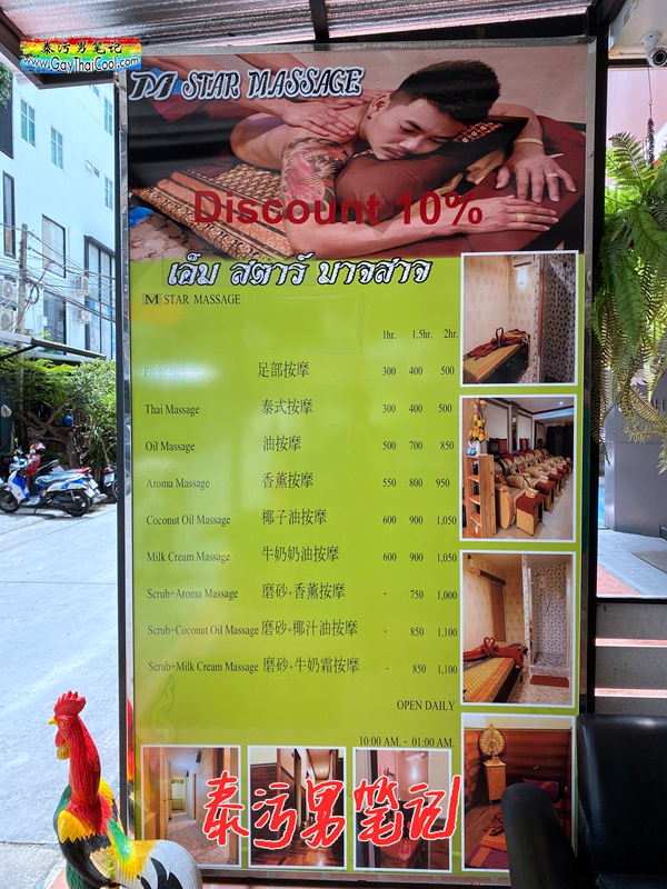 从按摩的价格来看,似乎整个6巷都是“统一标准”。泰式按摩300铢一小时,精油按摩500铢一小时。只不过疫情期间老板特惠,所有服务9折优惠。十次上店,免单一次。