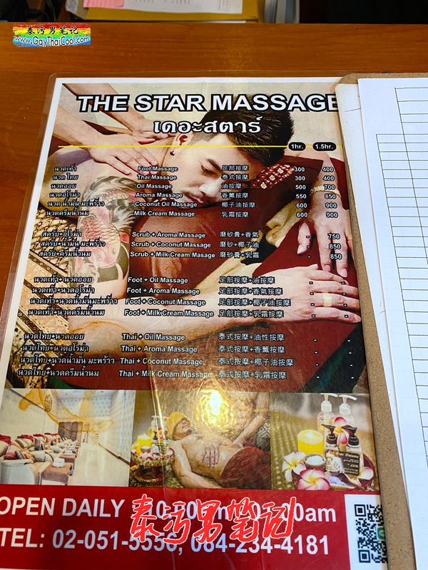 仔仔很老实,按摩的前半场并没有什么小动作。小编于是拉着K.korn聊天,问问店铺的历史,老板的背景,最近生意的情况,仔仔的家庭情况。K.korn回答的颇为仔细,还时不时纠正小编蹩脚的泰语发音。