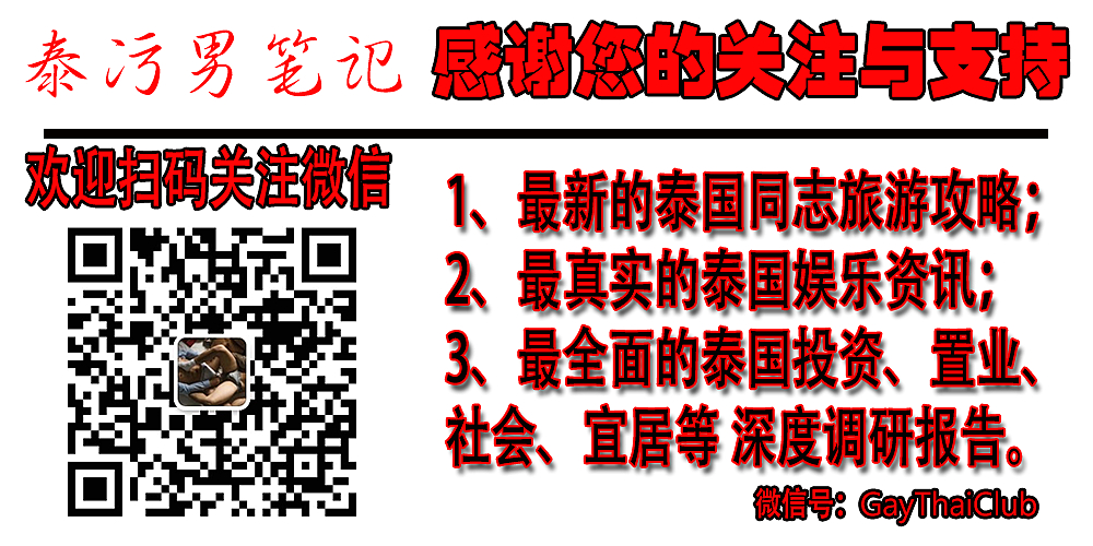 更多信息欢迎关注我们的“YouTube频道”及“同致暹罗”泰国吃喝玩乐基友论坛: 1、泰污男笔记YouTube频道:https://www.youtube.com/c/gbsiam; 2、同致暹罗基友论坛:https://www.gbsiam.com; 3、泰污男笔记官方微信:Gaythaiclub; 4、泰污男笔记官方Line:Gaythaicool;