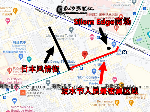 然而,Silom路上并不是所有区域都是一样的热闹。基友和同志最密集的地方是从Silom Edge商场一侧开始,一直洋洋洒洒到日本街为止,这一段是泼水节期间Silom路上人群最密集的地方。最热闹的同志夜店DJ Station以及GOD就位于这个区域。