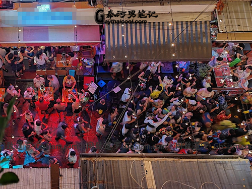 而Fake户外party需要提前订桌,泼水节前两天Fake户外Party门前甚至6、7点钟便已经排起了长队。整体Fake的户外场效果还不错。顶棚的水管不停地喷水,台上的男模赤身劲舞,台下的关注已经挤到几尽窒息。摩擦、相拥再配上一些酒精的催化,很快便略有微醺、略有兴奋。