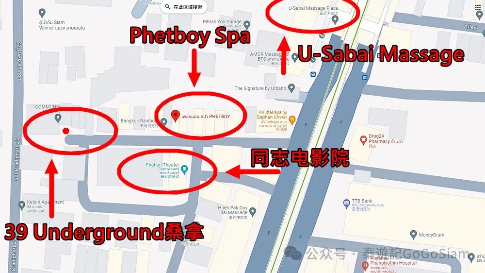 话说Underground 39同志桑拿所在的小巷,目前已经蓬勃发展。除了之前的『按摩店+同志剧院+同志桑拿』的组合,如今Phahonyothin Rd 1511号又新开『BRO公益组织』(HIV防疫及同志彩虹组织)以及Phetboy Spa等新店。这短短50米的小巷,如今已经热闹非凡。